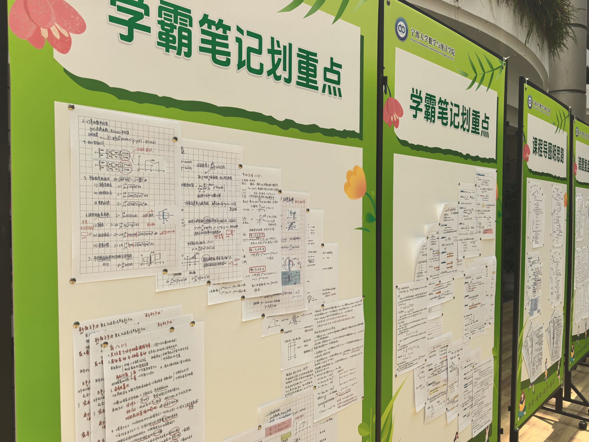 在学院大厅的展陈区域内,数份打印版复习资料分类有序粘贴在展板上,内容覆盖数学分析、高等代数、概率论与数理统计等核心科目。这些资料中,既有学长学姐们对知识点的系统梳理与真题解析,也包含易错题型标注及解题思路批注,部分草稿纸上还留存着反复推导的公式与修正痕迹,真实还原了学长学姐们备考过程中的思维轨迹。例如,其中一份高等代数笔记通过不同颜色标注定理证明的关键步骤,概率论习题集页眉处详细记录着公式推导的延伸思考,为学弟学妹们提供了可参照的学习范式。