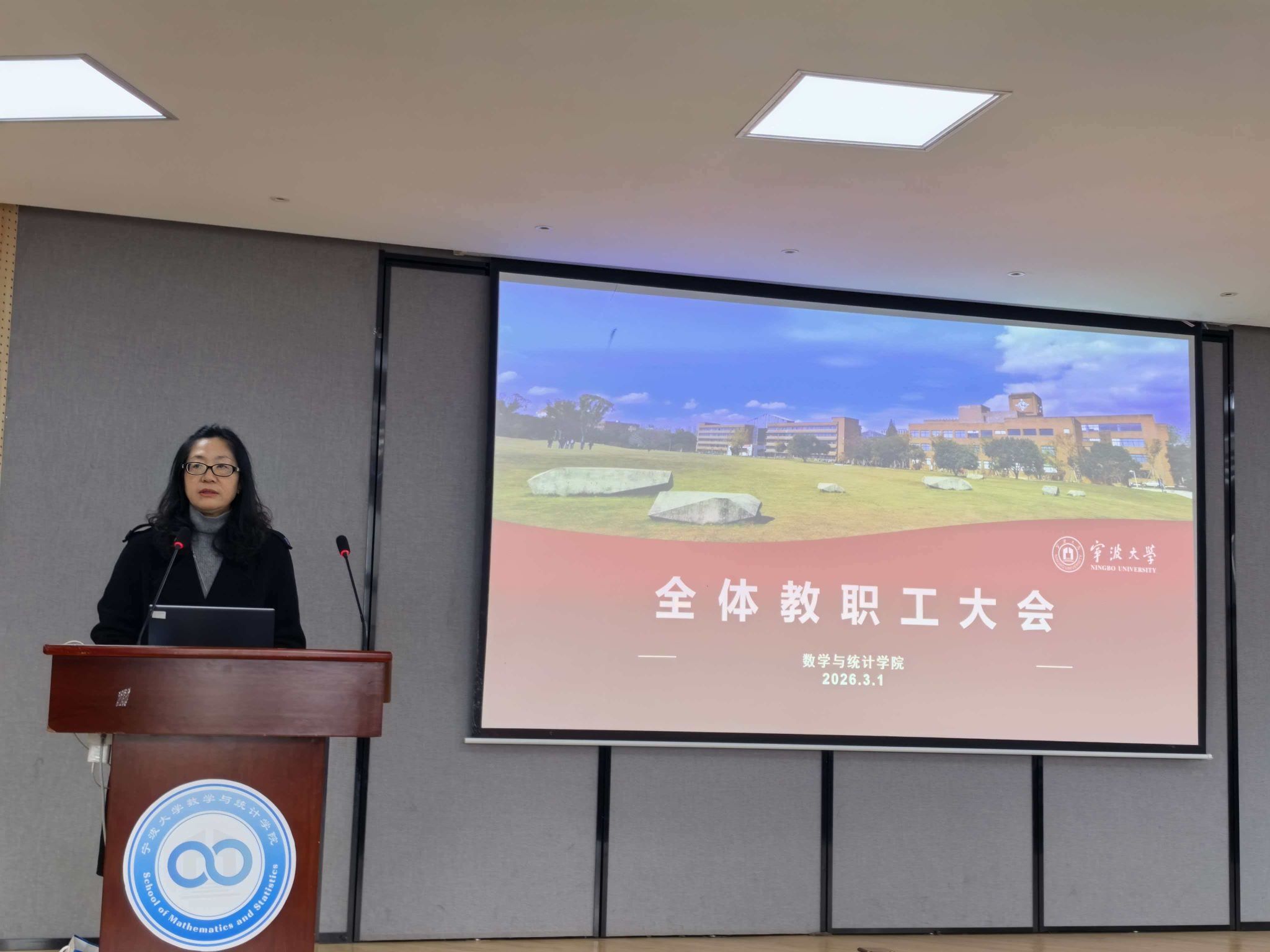 会上,霍妍首先传达了宁波大学寒假中层领导干部扩大学习会精神。她重点解读了校长蔡荣根关于学校“十五五”规划报告及2026年重点工作部署,强调“锚定目标、狠抓落实”的核心要求,并结合校党委书记张瑞丽“五个抓落实”的讲话精神,指出学院要聚焦高质量发展,将学校战略内化为行动自觉,为高水平建成国内一流地方综合性大学贡献数学力量。同时,她还部署了学院2026年重点工作,强调2026年是“十五五”开局之年,学院要围绕“强化党建引领、深耕人才培育、建强人才队伍、深化专业科研、拓展内外合作”五大核心任务发力。
