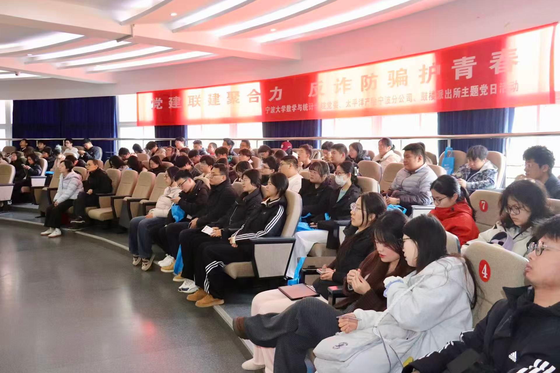 为进一步提升大学生的安全防范意识,有效遏制电信网络诈骗在校园内的发生,近日,博彩导航 党委积极发挥党建引领作用,携手平安产险宁波分公司、太平洋财产保险股份有限公司宁波分公司等党建联建单位,开展了以“党建联建共创平安校园”为主题的系列安全教育与文明寝室建设活动。