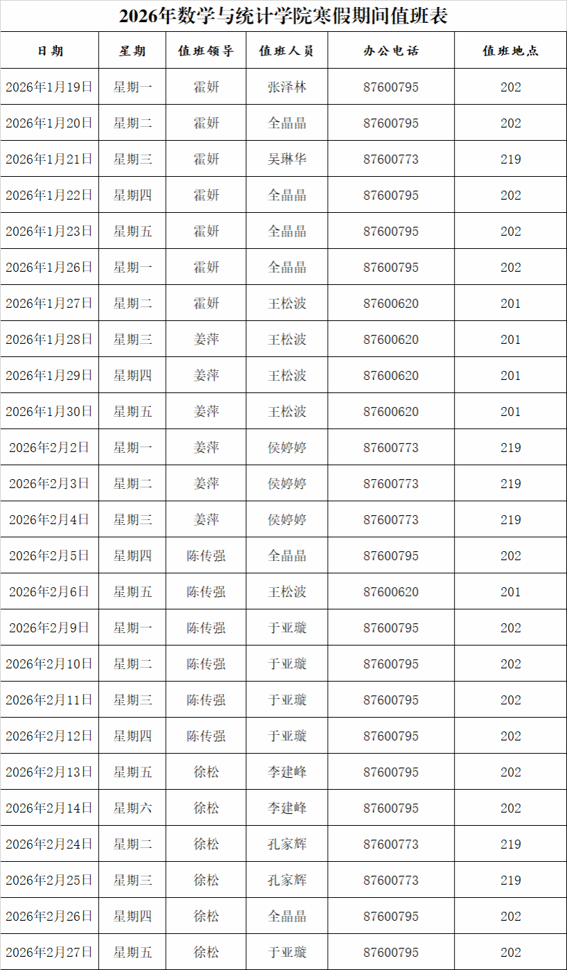 根据《宁波大学校长办公室关于2026年寒假和假期值班工作安排的通知》中的安排,寒假期间,各单位部门值班人员要明确工作职责,尽职尽责完成值班工作。值班时间为每天8:30-16:00。具体安排如下:
